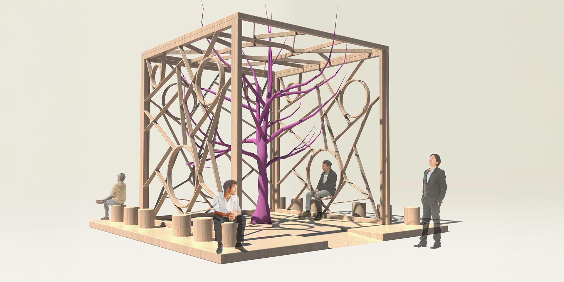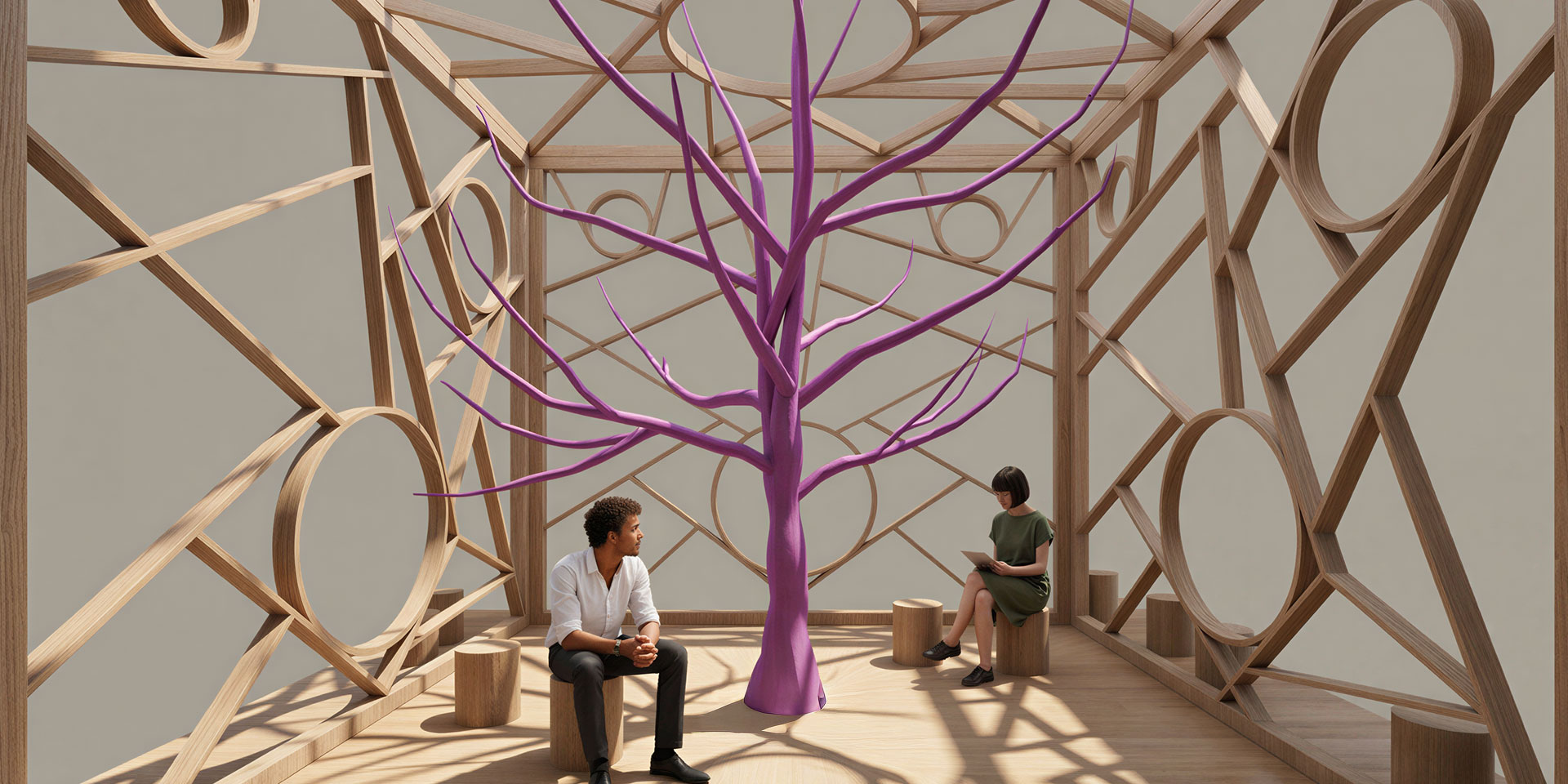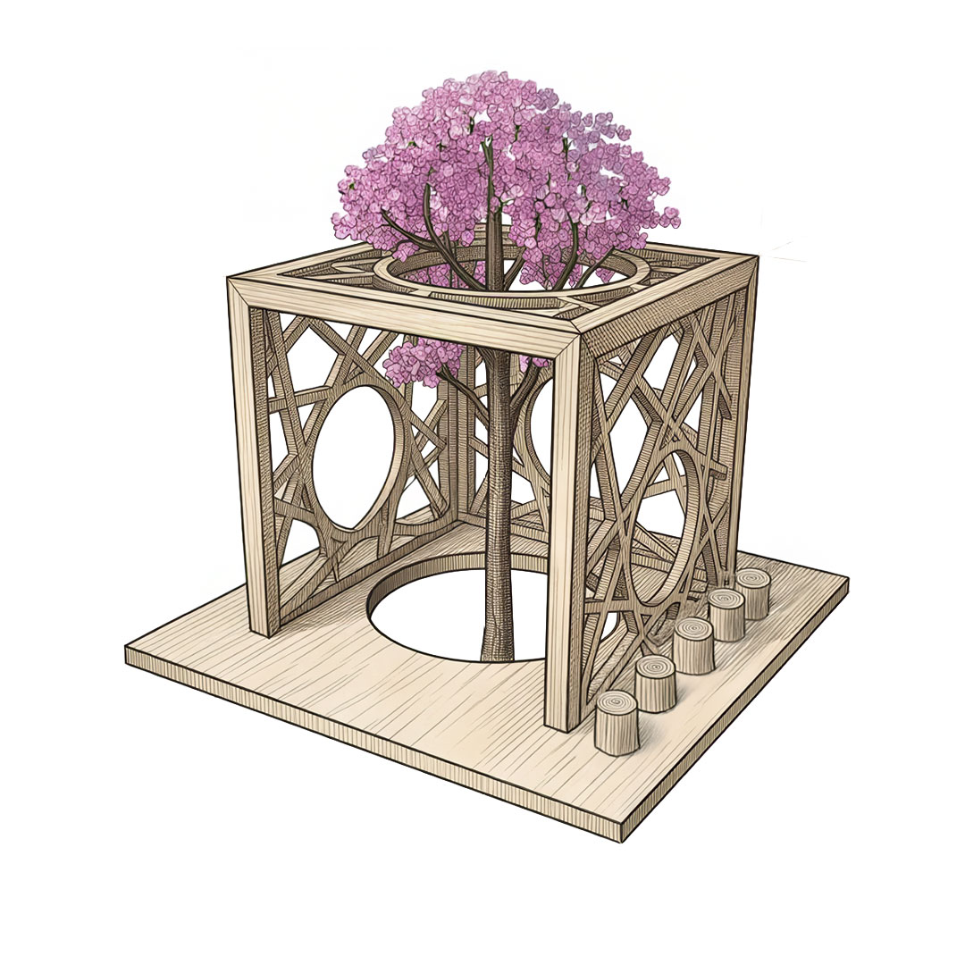 MM Design chose to entrust the entire narrative to the material itself. No claddings, no finishes. The result is a lattice structure featuring thin boards and reduced thicknesses that would be impossible to achieve with any other wood. At the centre of the cube, a stylised Paulownia emerges as a sculptural element: a sacred tree in Japanese culture, a symbol connecting earth and sky, and a living manifesto of the project's core philosophy. The design, signed by MM Design, conveys formal rigour and technical radicalism. The structure can support weights that are otherwise impossible for such thin profiles. This is not just an aesthetic suggestion; it is a practical, verifiable demonstration of SUPERTIMBER's exceptional qualities.