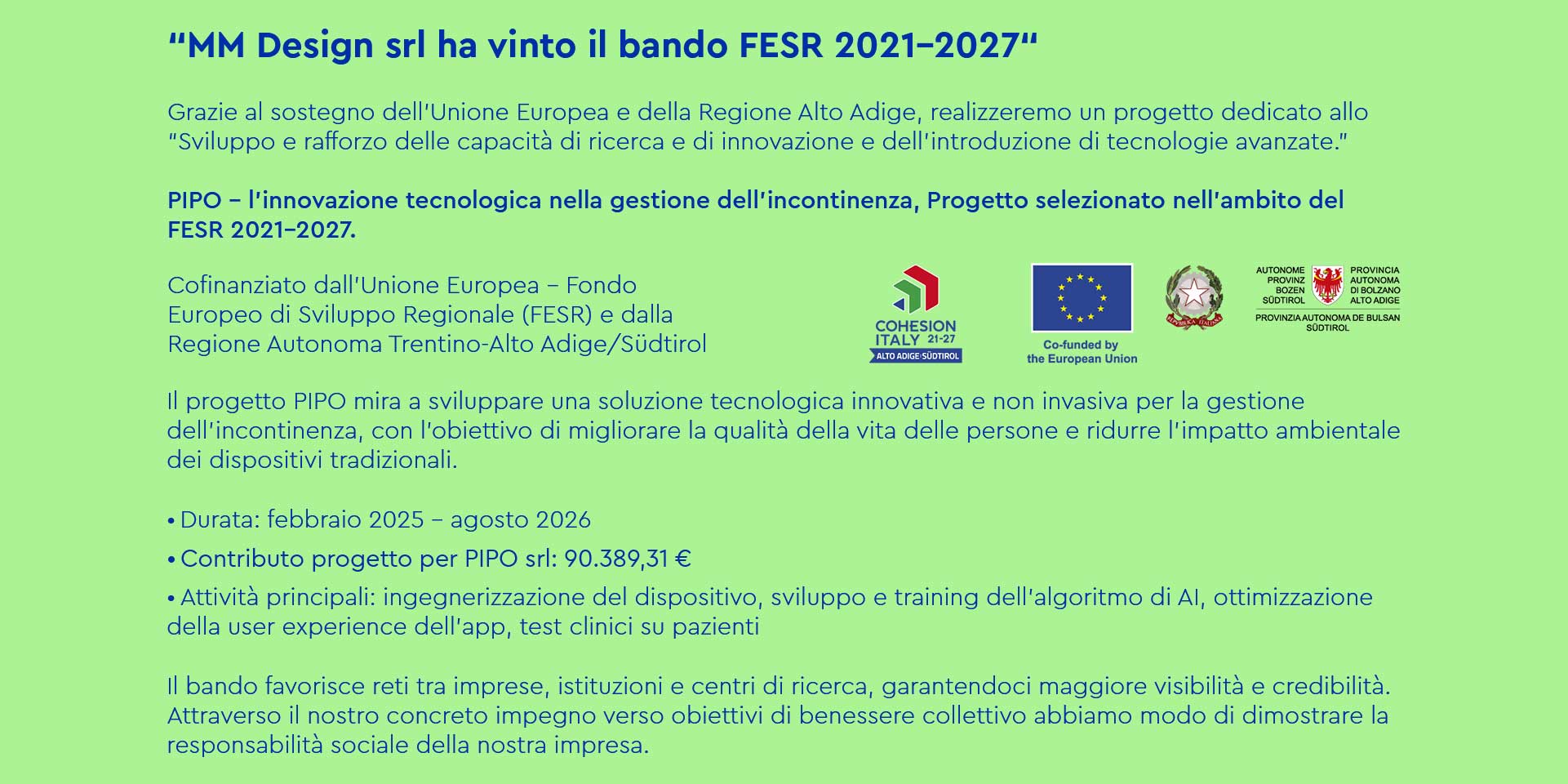 Siamo orgogliosi di annunciare che MM Design srl è stata selezionata nell'ambito del bando FESR 2021-2027, grazie al supporto dell'Unione Europea e della Regione Alto Adige/Südtirol.